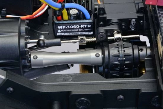 The DC1E features a slipper clutch to help protect the transmission, the transfer case features a servo controlled selectable 2-speed, providing a choice of speeds to suit all terrain. Metal links and heavy duty slider style driveshafts connect the front and rear axles to the transfer case, with each axle using steel gears and locker.