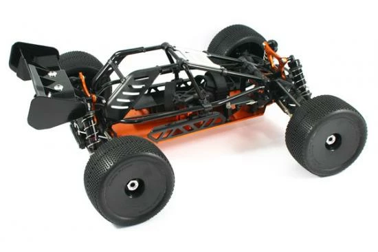 As an electric rolling chassis you are free to decide what electronic package is best for you and your budget. Underneath the roll cage you will find a chassis that can accommodate most of todays current crop of high performance brushless motors, speed controllers and LiPo batteries. The moulded battery tray features three quick release velcro straps perfect for 2S, 3S and 4S packs. Colour coded, anodised aluminium chassisparts complement the roll cage assembly for an eye catching look. The newly designed front C-Hub suspension assembly, 3-differential driveline and 17mm big bore shocks soak up all that is in their path.